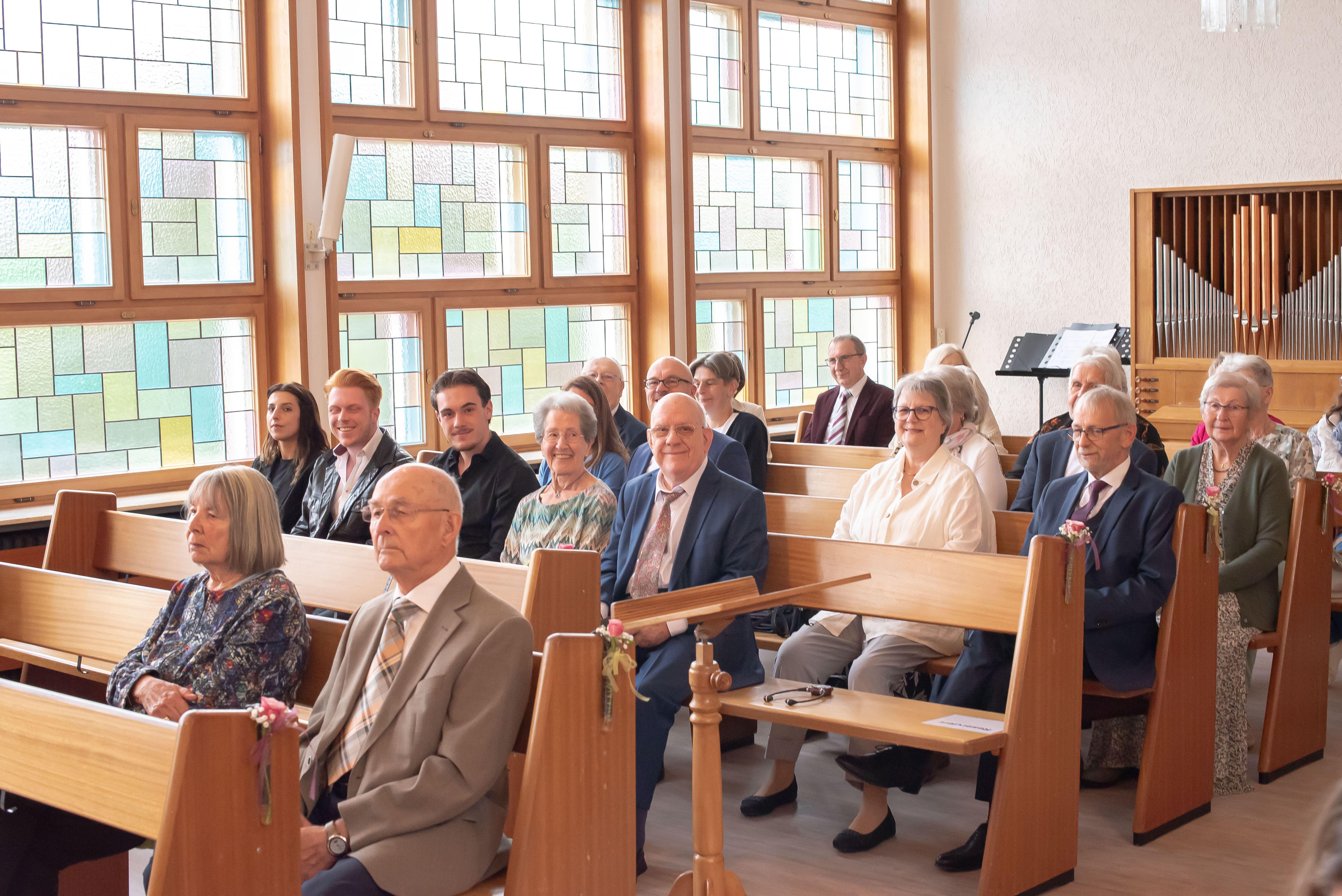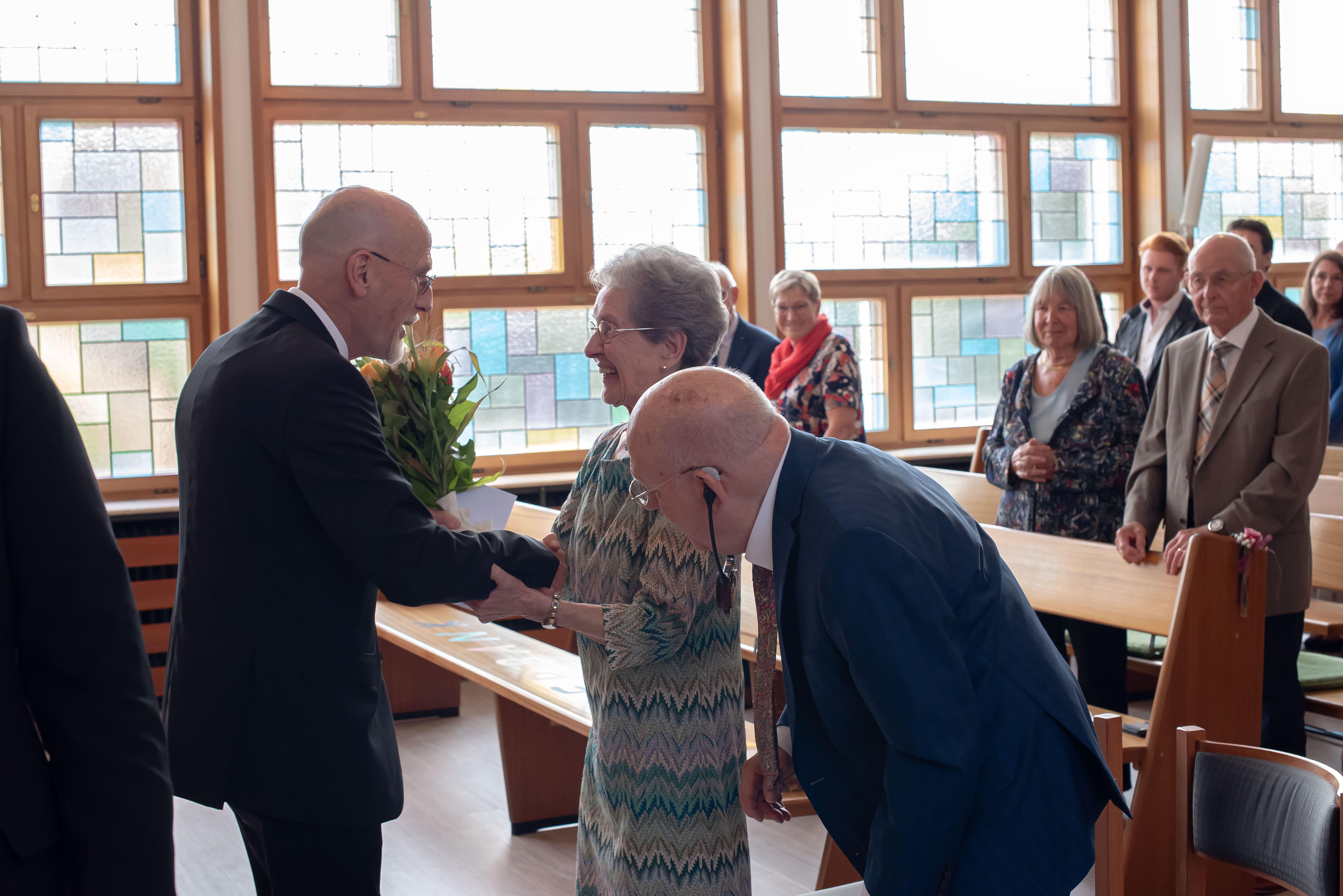 In der Segenshandlung wurde dem Jubelpaar eine Holzscheibe überreicht – aus einer Schwarzwald-Kiefer, standfest im Sturm, immergrün und mit vielen Jahresringen. Ein Bild für ihr gemeinsames Leben: 60 Jahre voller Licht und Freude, aber auch mit Last und Schwere – und doch immer Wachstum mit Gottes Hilfe. So wie die Ringe den Kern umschließen, so hat Gottes Liebe von Anfang an getragen. Und wie noch Platz für weitere Ringe bleibt, so schenkt Gott Zukunft. Begleitet wurde die Segenshandlung vom Wort aus 1. Korinther 13,13: